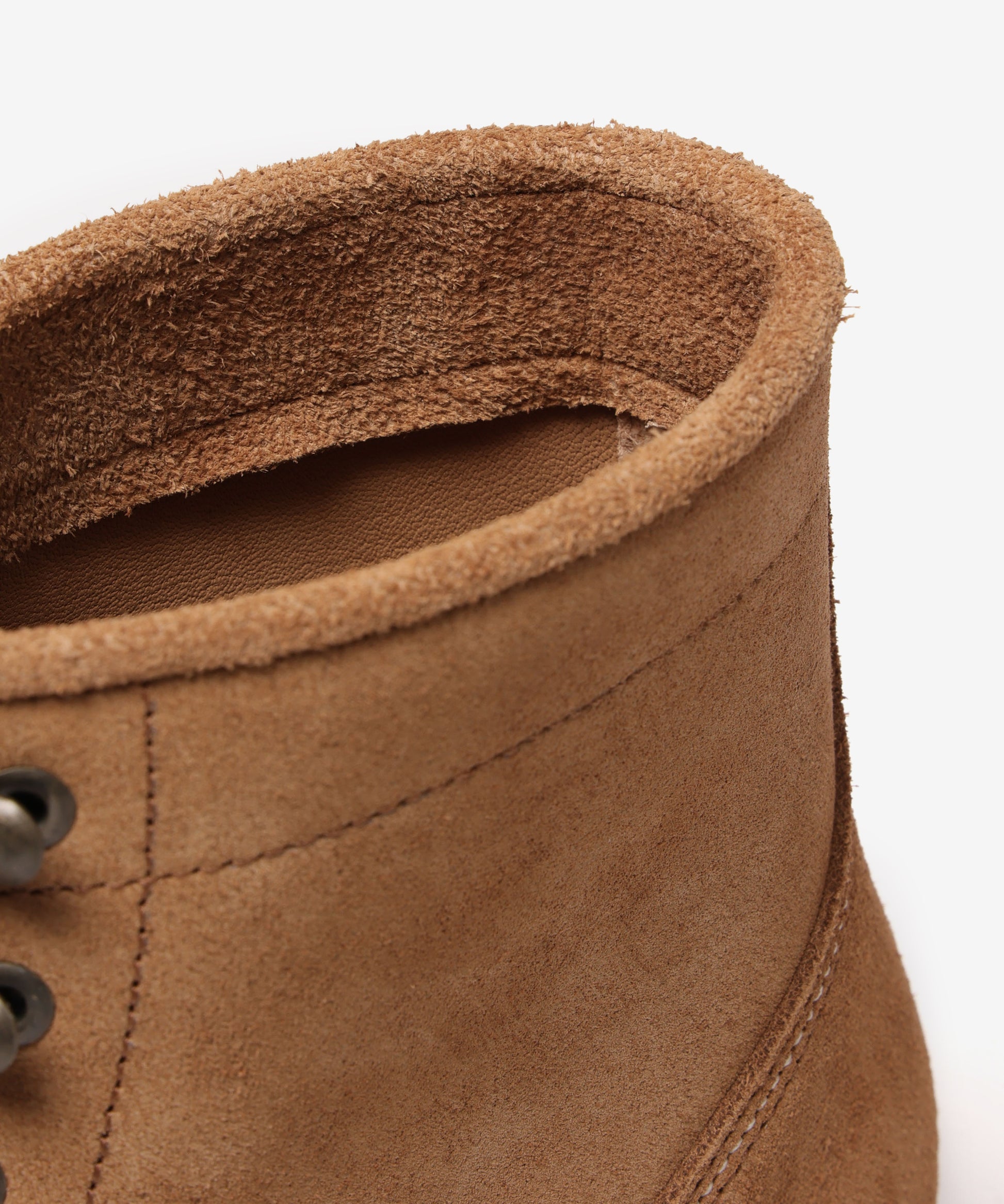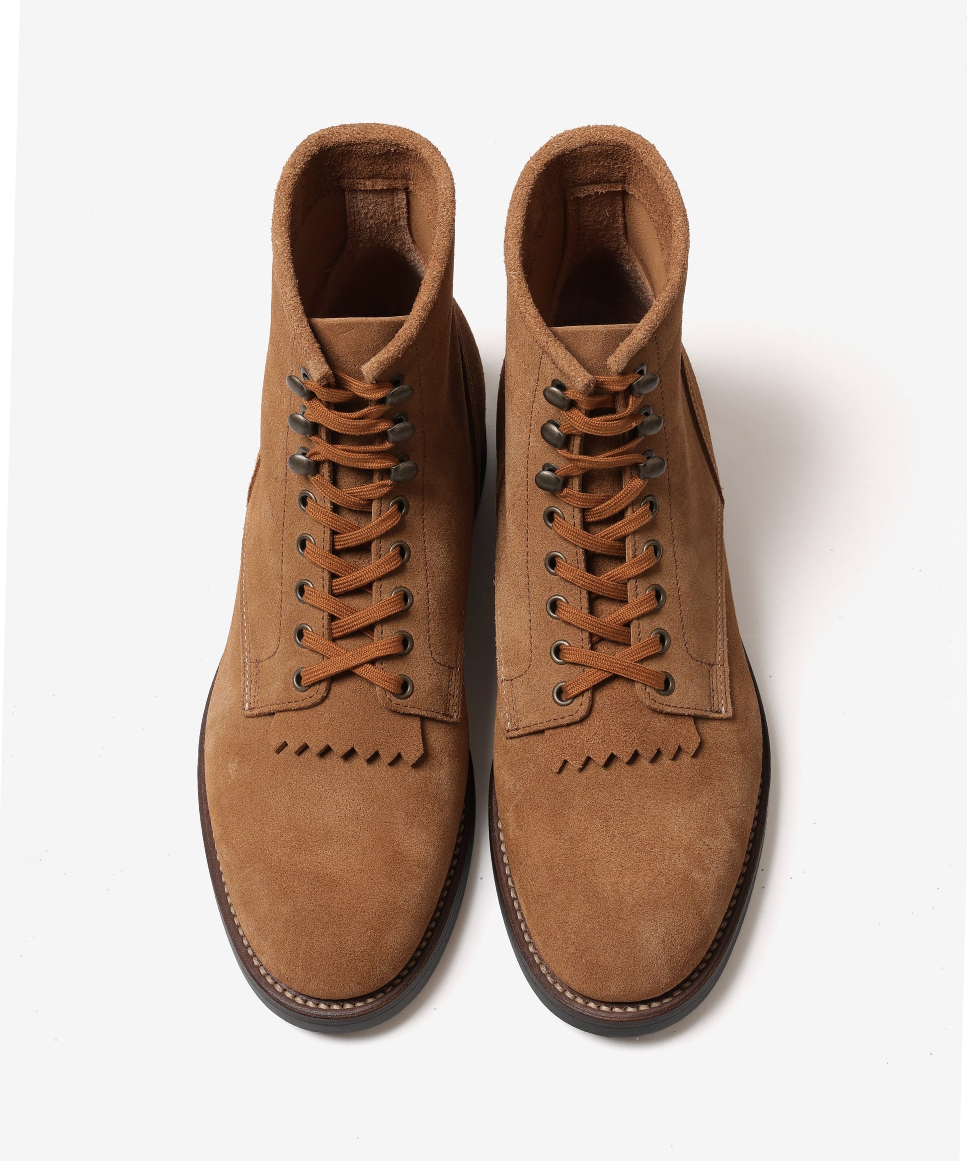 外羽根式の5ホール&3フック仕様で脱ぎ履きが容易。トリプルステッチの無骨な縫製とカットオフ仕様で茶芯の表情を引き出したアンクルブーツ。ライニングにはソフトな馬革を採用し、アッパーとの相性を調整。ヒールは3cm設計で安定した履き心地。シングルウェルト仕様で重厚感とスタイリッシュさを両立し、踵は補強パーツで耐久性を高めています。足首周りは1枚仕立てで馴染みやすい仕様。